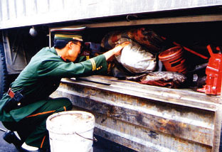 雲南德宏木康公安邊防檢查站,出色地執行對出入中緬邊境地區的人員、車輛及貨物的檢查、緝槍緝毒等任務。日前,該檢查站被國務院、中央軍委授予「緝毒先鋒站」稱號。 (攝影:劉建華)