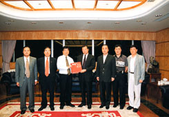 莊禮祥副書記(左三)和白天部長(右三)向本報張國良社長(中)致贈紀念畫冊。