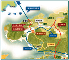 建議中的西部通道,跟后海灣幹線各長五公里,造價大約一百億,其中三成用在西部通道,通道由鰲磡石至蛇口東角頭,海關檢查站會設在蛇口,實施一地兩檢;后海灣幹線則從西部通道至元朗公路,並連接三號幹線以及屯門公路,以及二零一零年落成的十號幹線。當局將在明年年底展開收地,二零零三年正式動工,預計將在二零零五年完成。