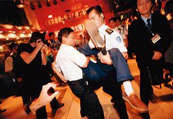 在一而再、再而三的警告無效情況下,保安人員被迫採取果斷措施,把蓄意闖入會場搗亂的法輪功成員抬出現場。 本報記者攝