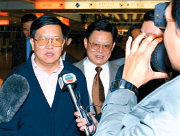 中國首席談判代表龍永圖(左)到達瑞士日內瓦機場時,向記者發表簡短講話。(美聯社)