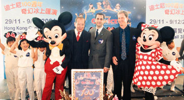 【本報訊】為慶祝和路迪士尼百歲生辰而舉行的大型冰上匯演——「迪士尼一百周年奇幻冰上匯演」將於今年十一月廿九日至十二月九日在香港舉行。負責製作冰上匯演的Feld Entertainment亞太區業務發展副總裁甄啟思昨日在記者會上指出:是次為該公司所製作的,規模最大的一次冰上匯演,單是溜冰表演者便已超過五十人,再加上華麗的背景和動聽的樂章,將令觀眾樂在其中。