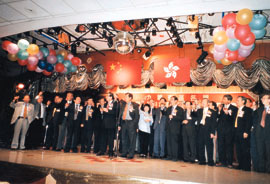 晚會於晚上八時開始,國歌高奏後,陳平主席首先致詞,兩位主禮嘉賓隨後致詞。會上眾人為祖國繁榮昌盛舉杯慶祝。由於祖國經濟表現強勁,並將加入世界貿易組織,更獲得二○○八年奧運主辦權。綜合國力更是歷史新高,與會人士皆祝願祖國更加富強穩定。香港近年雖受亞洲金融危機及近期美國九•一一事件的影響,經濟大受波及,但有強大的祖國作為後盾,加上香港市民的努力,相信困境終將過去,本港與祖國內地將會分享經濟繁榮的成果。