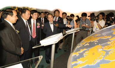 曾蔭權在特區訪問團西部行過程中,向內地官員和工商界介紹香港優勢博覽會上的展品。