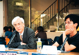 何文匯(左)出席論壇向學生解釋「英語試」的問題。