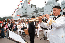 香港市民登艦參觀後,在碼頭欣賞海軍樂隊的演奏。一曲《梁祝》,婉轉深情,贏來熱烈掌聲。(新華社記者楊嘉理攝)