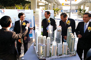 香港地鐵公司與香港四大房地產開發商共同參觀「Union Square,聯合廣場」的建設模型。(新華社)