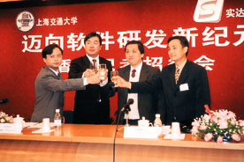 實達銘泰總裁何恩培、實達科技主席史偉、上海交大副校長許曉鳴及實達科技行政總裁趙嗣舜在簽協議後祝酒。