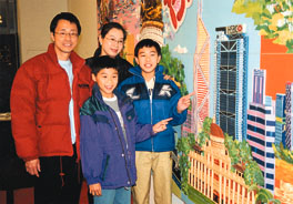 余先生一家四口參觀畫展,兩位小朋友更有份參與「香港-我的家」彩紙浮雕的製作。(本報記者 莊海源攝)