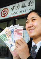 中國銀行從二日起已開始在全國兌換新歐元現鈔。二日的兌換率為一歐元兌7.1348元人民幣。 (美聯社)