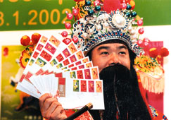 香港郵政昨天發行「歲次壬午(馬年)」郵票,並特別請來財神爺作宣傳。趙焜崗攝
