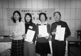 成為優秀社工殊不容易,其工作必定得到各方面的肯定,四位得獎社會工作者,昨日讓大家分享她們的經驗。葉慧蓉二○○○年才加入社會工作者行列,被派往學校當駐校社工。她表示,從來沒想過學童自殺會在自己工作的學校發生,可是到校不久,校內一名學童因被父親責罵後跳樓自殺,學童的母親不斷指責丈夫,認為他迫死孩子。後來葉姑娘分別與他們傾談,解開了雙方心中的鬱結,原諒了對方,更相擁而哭,十指緊扣。葉姑娘稱,經此事後,他們彼此加深了了解。