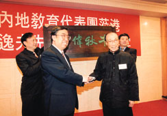 當邵逸夫先生從中國教育部副部長呂福源手中接過這面珍貴的匾額,顯得容光煥發,異常精神。他連連用手觸摸著匾額,詳問是什麼木料,並笑呵呵地連聲說:好!好!呂福源副部長高興地告訴邵老,這是教育部長陳至立特別囑托他帶來的,他代表部長將題匾呈送予邵先生。匾額由中國著名書法家歐陽中石先生書寫,中央工藝美術學院設計,著名紅木雕塑大師屠杰雕刻。匾額採用世界上最珍貴的木材之一——產自印度的樹齡在一千二百年以上的優質檀香紫檀木製成。
