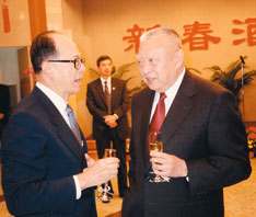 董建華首先見到了本港首富李嘉誠,董建華走上前和李嘉誠握手,並關切地說「你好似瘦了」,並說「新年恭喜發財」,兩人單獨交談十餘分鐘,足見他們交情不淺。隨後,董建華又與新世界集團鄭裕彤、美心集團伍沾德等一一握手拜年交談,莫非是在醞釀什麼新經濟政策,希望這些富豪出手參與? 本報記者 寧方