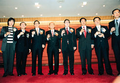 在體育界新春宴會上,霍英東及霍震霆與多位主禮嘉賓上台祝酒。