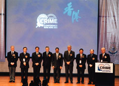 圖:出席會議的各國及地區警察首腦和主講嘉賓,左起:加拿大皇家騎警處長辛德廉、中國公安部刑事偵查局局長張新楓、曾蔭培、李國能、國際刑警秘書長羅秉義、英國警務監察總長布宏輝、新加坡警察總監邱文暉、英國威爾斯加的夫大學犯罪學教授利偉賢和江樂士。(本報記者 趙焜崗攝)