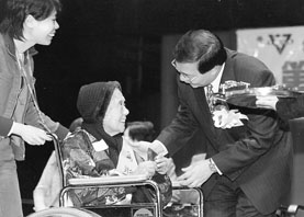安老事務委員會主席譚耀宗,向一位坐輪椅的義工婆婆頒發金獎,以表彰她參與義工服務達二百小時。