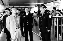 羅湖邊防薛振傑政委(左二)在羅湖橋頭聽取葛萬新總站長(中)介紹過境人潮情況。 (本報深圳傳真)