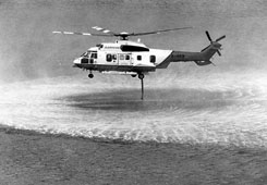 美洲豹直升機擁有十五呎長的吸水泵,圖為直升機示範於水面吸水。(本報記者 劉國權攝)