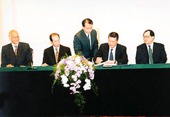 澳門特區政府與澳博簽署《澳門特別行政區幸運博彩或其他方式的博彩經營批給合同》儀式,昨日下午三時在澳門特區政府總部舉行。澳門行政長官何厚鏵與澳門博彩股份有限公司負責人何鴻燊分別代表簽署,標誌澳門博彩業進入新一個階段。