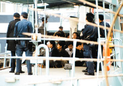 水警在一艘機動舢舨上拘捕越南非法入境者。