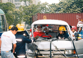 消防員正拯救被困的司機。