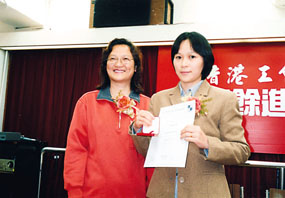潘素暉(右)從工聯會副理事長林淑儀手上接過「LCC&I」證書及金牌。