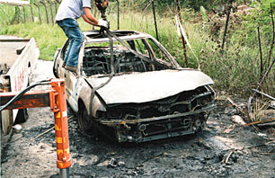 【本報訊】上水燕崗村昨晨發生劫案,一對從事中港貿易的父子駕車押送四十萬元往銀行時,被劫匪駕車攔腰撞去,兩父子落車理論時被水喉通擊傷,匪徒乘機掠去現款跳上賊車逃去,受傷父子送院救治,事後匪徒所乘的私家車在洲頭村被人放火燒毀,相信匪徒意圖毀屍滅跡,警方已進行調查,不排除案件有「內鬼」,現正展開調查。