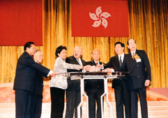 霍英東、董建華、姜恩柱、劉延東、吉佩定在李東海、莊世平陪同下鳴放禮炮。 (李治淮攝)