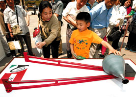 這是一位媽媽在向兒子講解中國科技館展出的「錐體上滾」的物理原理。(新華社)