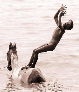 印度孟買持續高溫,少年牧馬人游水降溫。