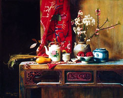 從構圖而言,陳子達對物品的擺放似是隨意卻作了刻意的經營,有主有次,有散有聚,有呼有應,構成整體畫面的平衡與莊重、融洽與和諧。筆者格外欣賞畫家在色調方面的把握能力,經常以紅黑的對比突出主題,又以藍綠褐等色彩和諧了全局。畫家的明暗層次表達倍顯功力,在質感的表現上有獨到的效果。