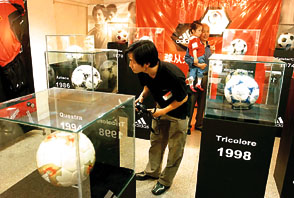 在其中最大的足球廠家卡比塔爾體育公司,記者看到當地工人身穿挎籃背心,坐在低矮的板凳上專注地工作著。他們將一塊塊龜背骨形狀的皮子對縫起來,當成為一個球體後便往內膽充上氣,在外表面印上本屆比賽的會標以及委托生產的德國企業名字和「國際足球聯盟公認」的字樣。
