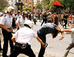周四於西班牙東南部木爾西亞,在抗議政府收緊失業福利的全國大罷工期間,一名警員使用橡膠棍毆打糾察員。 (美聯社)