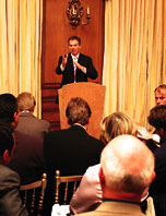 英國首相貝理雅廿日在唐寧街首相府舉行的一個記者會上回答問題,以爭取更多選票。(美聯社)