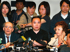 賴昌星(中)周五難民申請遭駁回後,在律師馬塔斯(左)陪同下於溫哥華出席記者會。 (路透社)