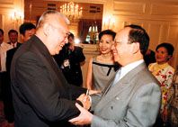董建華在禮賓府歡迎台灣代表團並與章孝嚴握手,就兩地經貿發展交換意見。