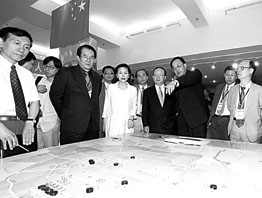 由台灣政界知名人士章孝嚴(右二)率領的台灣「中國台商發展促進協會三通參訪團」一行,二十四日在劉敬民(右一)副市長的陪同下來到北京第二十九屆奧運會組委會,參觀了奧運村沙盤。(中新社)