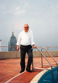 在合和頂層的泳池側留影,胡應湘笑指背後就是經濟發展一日千里的大陸。