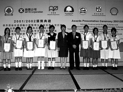 由環境保護運動委員會聯同環境保護署及教育署合辦的「學界環境保護獎勵計劃頒獎典禮」昨日假香港會展中心舉行,以表揚各方人士對推廣環境教育之工作。頒發獎項包括○一至○二年度學界環境保護獎勵計劃、學生環保大使計劃、大專環保活動獎勵計劃和全國中小學生廢舊物品雕塑設計比賽等。
