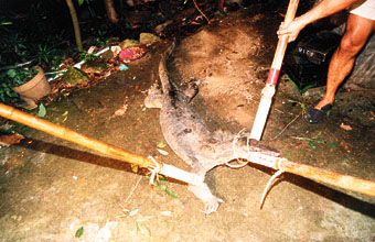 但村民仍不甘心,他們隨即取來一些硫磺在車邊焚燒,企圖以毒煙攻入車底及車廂內。至晚上十時許,村民發現蜥蜴被困車底,因此通知愛護動物協會人員到場,但仍無法將牠救出,需勞動消防員到場將車輛升高,最後由愛護動物協會人員用狗索將之擒獲。