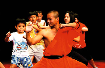 小朋友上台向少林僧人學耍少林拳法,看起來很認真呢。