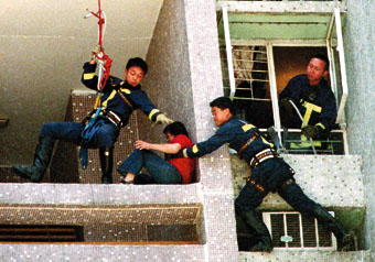【本報訊】上月二十八日在大埔用刀斬傷前度男友的一名婦人,昨晨往運頭塘h疑向對方道歉及央求撤銷起訴時,雙方再起爭吵,期間婦人攀出十七樓大廈外狹窄簷篷企圖跳樓輕生,警方談判專家及消防員經七小時游說,最後乘其疲倦,合兩名消防員之力,將婦人救回。