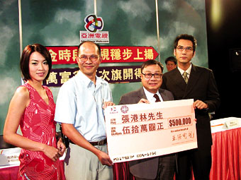 陳永棋主持亞視《百萬富翁》復播後第一個五十萬元支票頒發儀式。