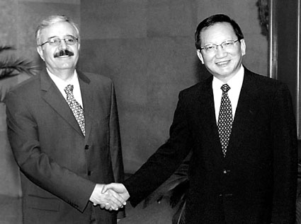 8月27日,外交部長唐家璇在北京會見伊拉克外交部長納吉•薩布里•艾哈邁德。 (新華社)