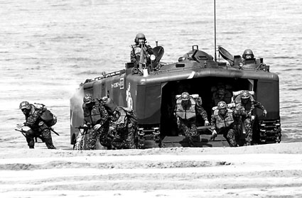 【本報訊】據《東森新聞》台北二十七日報道:陳水扁提出「一邊一國」主張後,兩岸情勢對峙,北京計劃在九月舉行大規模軍演,台軍二十七日在高雄左營海灘舉行海軍陸戰隊登陸演習,實施突擊演練,陸戰隊隊員在炮火掩護下搶灘。