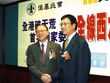 恆基張炳強(左)委任美聯黃建業代理西九龍四盤貨尾。(周穎攝)