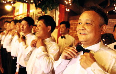 圖為餐館五十五歲的服務員屈見昌(右)與同伴一道整理領結,準備上崗。(新華社)