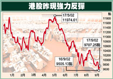 【本報訊】(記者 唐浩)港股昨日一洗頹勢,反覆大升202點至9707點。伊拉克同意聯合國重臨當地武器視察,紓緩中東局勢,兼政府將提早結束盈富基金持續發售機制,市場在基金補倉盤的推動下,節節上揚,成交增至66億元,為一個月來新高。即月期指收9715點,大升245點,成交大增至22775張。