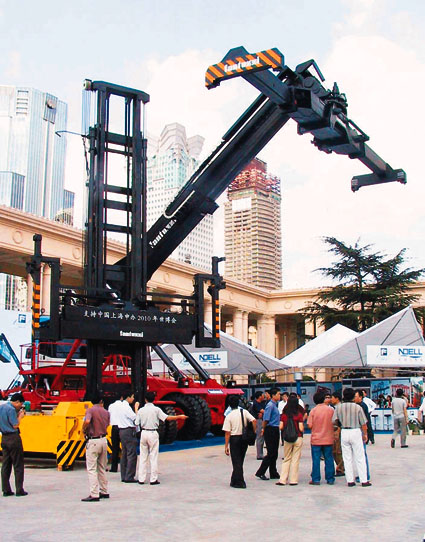圖為德國諾爾起重設備公司正在展出的集裝箱龍門起重機。(中新社)
